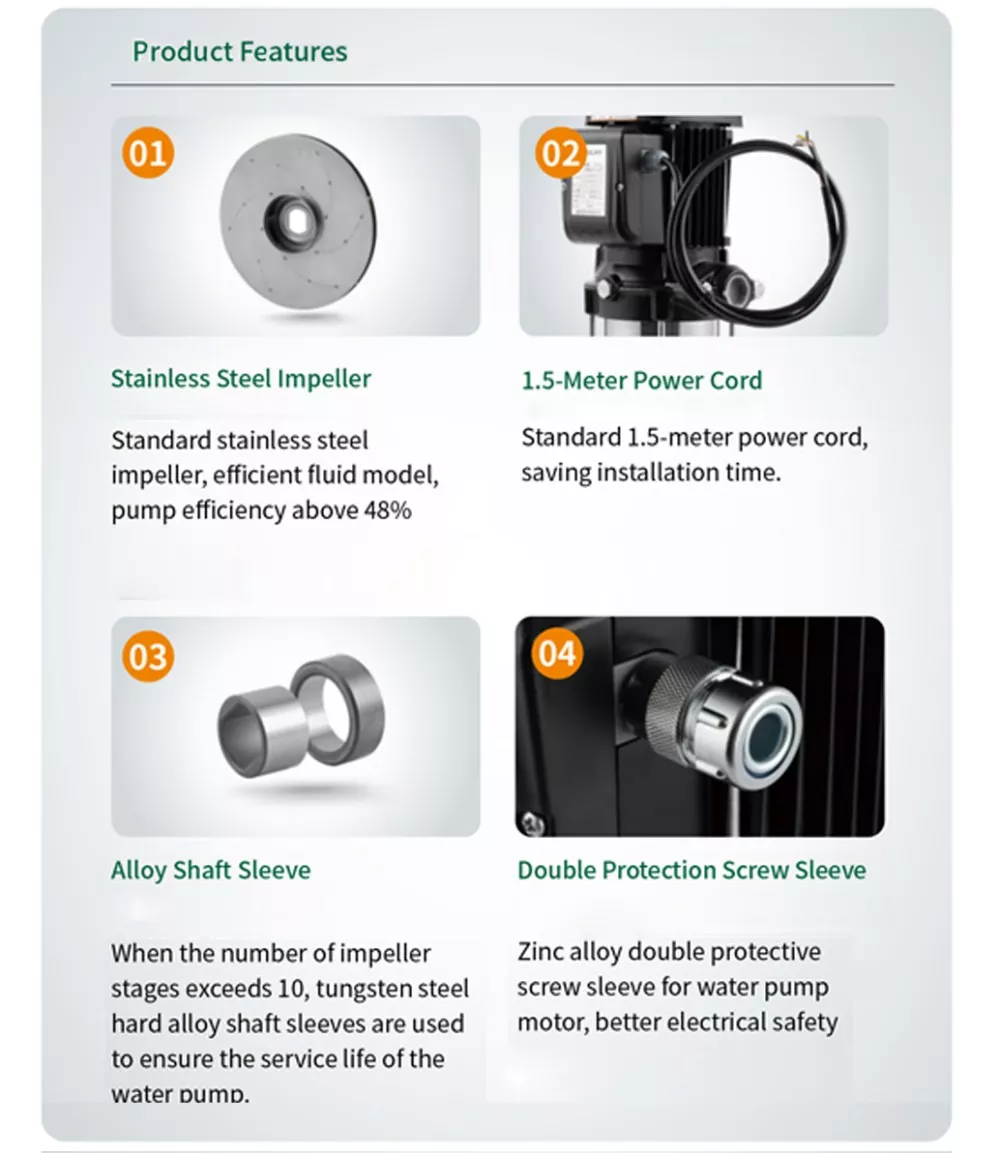 · الأختام الميكانيكية المصنوعة من سبائك صلبة + مطاط الفلور تقلل من التسرب واستهلاك الطاقة، مما يضمن التشغيل السلس والهادئ.